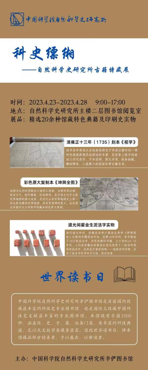 中国科学院自然科学史研究所俨图书馆是目前国内收藏最丰富的科技史专业图书馆,也是国际上收藏中国科技史文献最丰富的专业图书馆。本馆现有古籍2500种,涵盖经、史、子、集、丛各门类,有丰富的种技典籍,尤以天文数学类藏量最富。值此世界读书日,择本馆藏品部分精善者,予以展出,以飨读者。