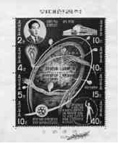 图二:北韩政府为纪念金凤汉研究发行的邮票。图左上方为金凤汉本人照片;右上为北韩经络研究所;下方环状物则为凤汉管的图示。(作者提供)
