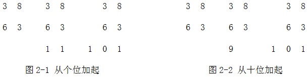 也许因为算筹记数非常简单,古代数学经典中没有记载用算筹做加减的具体做法。但可推知其算法与现代笔算加减的方法差不多,只是用算筹更灵活,既可先从低位算起,也可先从高位算起。以下是计算38+63的两种图示(为便于现代读者的习惯,用印度-拉伯数字代替算筹):