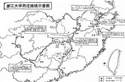 1937年8月13日,抗战史上著名的淞沪会战拉开帷幕,毗邻上海的杭州很快也笼罩在战火中。为保全学校和寻求一个安定的教学环境,浙大开始准备避难迁移事宜。8月26日,校长竺可桢赴杭州附近的东天目山考察,决定设分校和临时办事处,接纳一年级新生报到。之后杭州形势紧张,11月5日侵华日军在杭州湾登陆,浙大决定全校集中迁往建德。在举校西迁之前,竺可桢10月初已先行赴建德觅址,并派人筹建临时校舍。但这只是浙大迁徙的开始,随着战火的蔓延,再迁吉安、泰和,三迁宜山,四迁遵义,在两年多的烽火岁月里,浙大师生被迫一路西行,一路播迁,经浙、赣、湘、粤、桂、黔六省,至1940年初定址遵义湄潭,铸就了一段波澜壮阔的历史,浙大的西迁路线和中央红军长征路线相似,被誉为是“文军长征”。