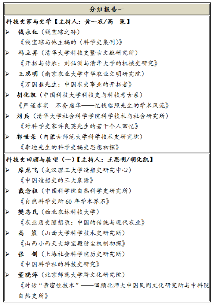 为缅怀老一辈科技史家的治学精神和学术贡献,此次学术研讨会特邀部分机构学术带头人做了专题报告。自然科学史研究所张柏春研究员、韩琦研究员、清华大学科技史暨古文献研究所冯立昇教授、同济大学建筑与城市规划学院常青院士、南京农业大学中华农业文明研究院王思明教授、自然科学史研究所华觉明研究员、中国科技大学科技史与科技考古系胡化凯教授、钱宝琮之孙钱永红先生、上海交通大学科学史与科学文化研究院江晓原教授、纪志刚教授、内蒙古师范大学科学技术史研究院郭世荣教授、清华大学社会科学学院科学技术与社会研究所刘兵教授等纷纷缅怀了竺可桢、李俨、刘仙洲、梁思成、万国鼎、王振铎、钱临照、钱宝琮、席泽宗、严敦杰、李迪、许良英等老一代科技史家“开辟草莱”的卓越贡献。