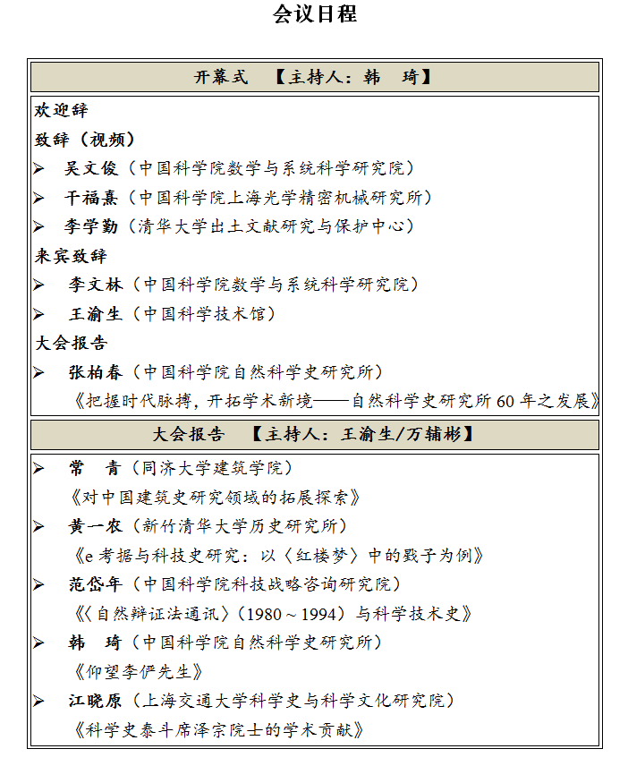 在开幕式上,吴文俊院士、干福熹院士和李学勤教授分别致辞(视频),中国科学院数学与系统科学研究院李文林教授、中国科技馆原馆长王渝生研究员到会致辞。自然科学史研究所所长张柏春研究员、同济大学建筑学院常青院士、台湾新竹清华大学黄一农院士、中国科学院科技战略咨询研究院范岱年研究员分别做了“把握时代脉搏,开拓学术新境——自然科学史研究所60年之发展”“对中国建筑史研究领域的拓展探索”“e考据与科技史研究:以<红楼梦>中的戥子为例”“《自然辩证法通讯》与科学技术史”等大会报告。