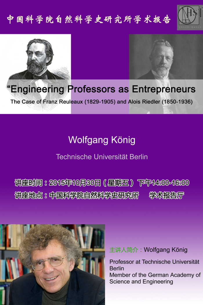 10月30日学术报告:Engineering Professors as Entrepreneurs: The Case of Franz Reuleaux (1829-1905) and Alois Riedler (1850-1936)