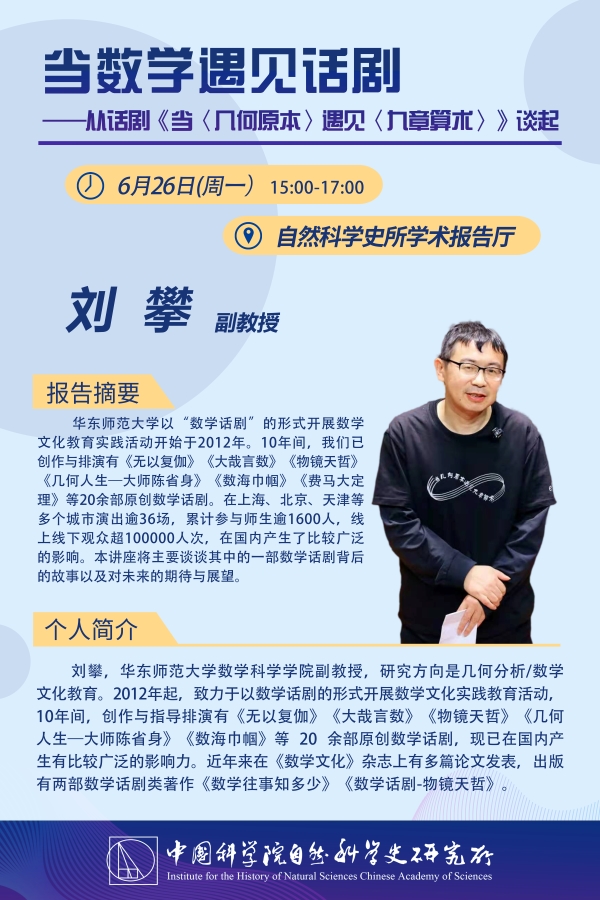 报告标题:当数学遇见话剧—从话剧《当〈几何原本〉遇见〈九章算术〉》谈起