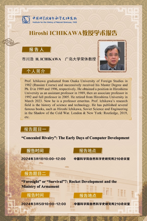个人简介:Prof. Ichikawa graduated from Osaka University of Foreign Studies in 1982 (Russian Course) and successively received his Master Degree and Ph. D in 1989 and 1996, respectively. He obtained a position in Hiroshima University as an assistant professor in 1989, then an associate professor in 1992 and full professor in 2005. He retired from Hiroshima University in March 2023. Now he is a professor emeritus. Prof. Ichikawa’s research field is the history of science and technology. He has published several famous books, such as Hiroshi Ichikawa, Soviet Science and Engineering in the Shadow of the Cold War. London & New York: Routledge, 2019, etc.