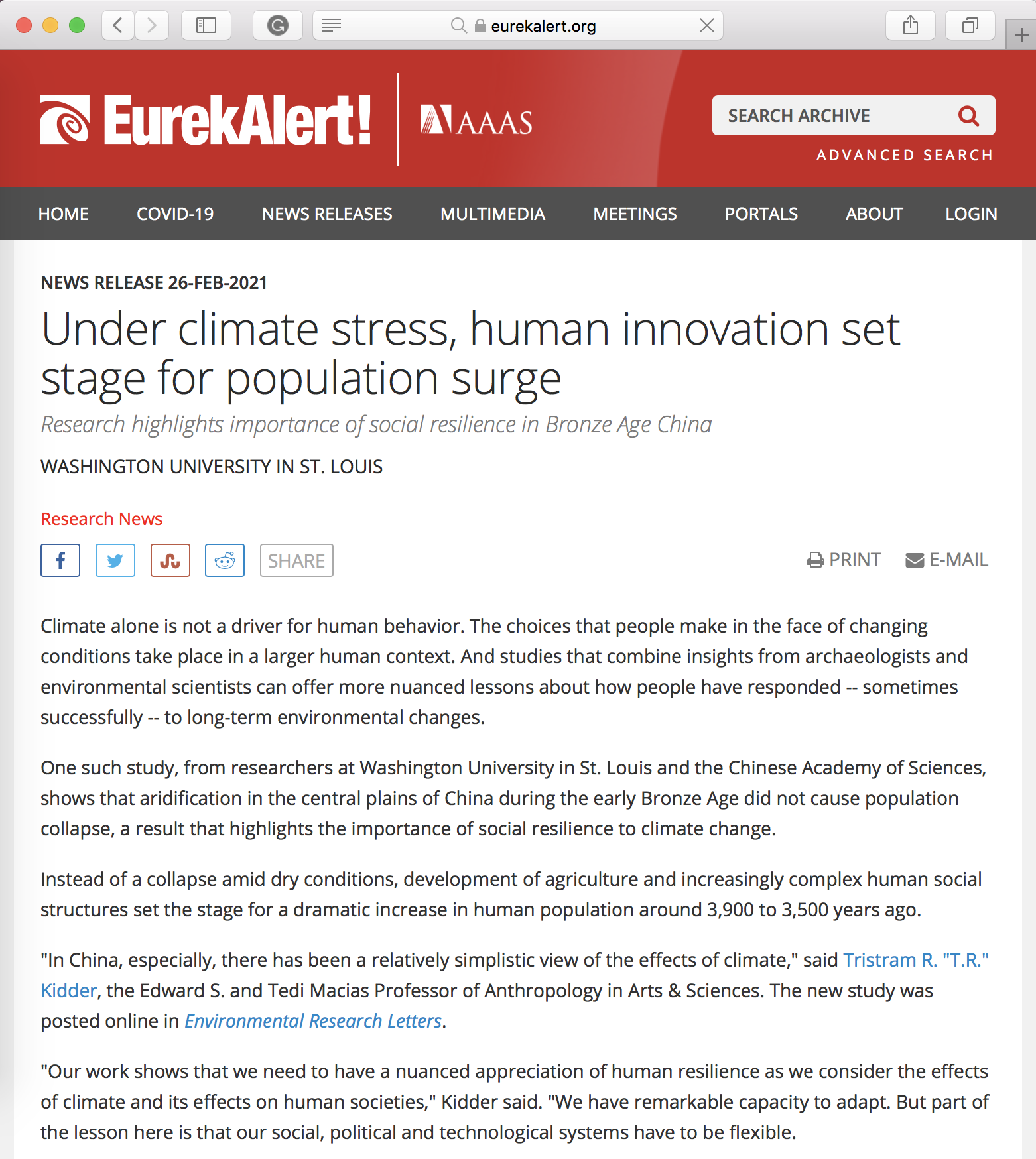 文章上线后,美国科学促进会(AAAS)主办的全球科学新闻发布平台“EurekAlert!”以“Under climate stress, human innovation set stage for population surge”为题,对该项成果进行了报道。随后,ScienceDaily、Newswise、Scienmag、Sciencenewnet.in等多家科学新闻媒体予以转载。