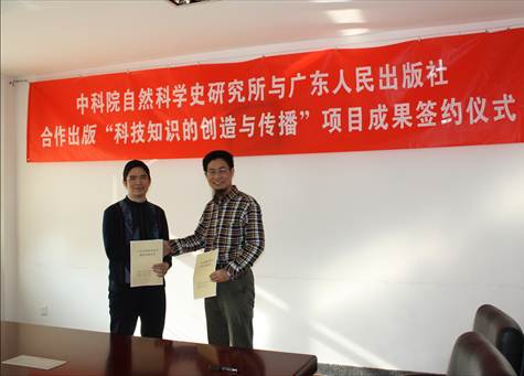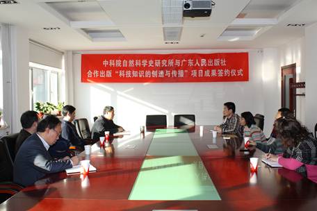 2013年1月9日,中国科学院自然科学史研究所与广东人民出版社合作出版“科技知识的创造与传播”项目成果签约仪式在我所举行。参加签约仪式的有自然科学史研究所所长张柏春研究员,广东人民出版社编审、总编辑卢家明编审,广东人民出版社古籍与辞书编辑室主任、副编审柏峰,“科技知识的创造与传播”重大项目负责人罗桂环研究员和韩健平研究员,部分课题负责人韩琦研究员、曾雄生研究员、韩毅副研究员,以及科研处陆岭等。