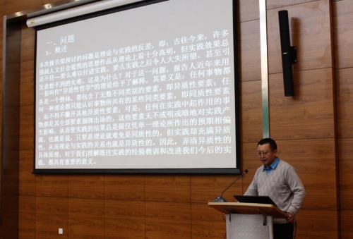 报告人探讨了事物之间实存的三种联系,即:(1)独立自在事物和依它而在事物的联系;(2)独立自在事物之间的同时性联系;以及(3)独立自在事物之间的异时性联系。在此基础上,引出事物之间“同质性”与“异质性”两种性质的关系,“同质性”强调事物间及事件的共有性要素或普适性品质,而“异质性”则关涉事物个体及事件所包含的独特性要素及具体的关联性语境。“异质性”联系主要包括两类,即同进性的异质联系(牵连),以及异时性的异质联系(延异)。报告人认为,无论是事事意外,还是事事必然,皆不必料,要想理解事件或行为的后果并进而进行预测和管控,关键在于理解异质的因果关系。异质性理论所抓取的问题关键是“是”与“做”的关系,或是说理论与实践的关系,从理论上所看到的分门别类的对象是在实践中整体出场的,这就要求实践思维必须对实践个案所关涉的异质性理论对象作综合考量,实践无非是异质性的操作。