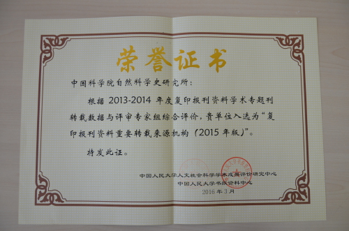 3月29日,2016中国人民大学人文社科成果评价发布论坛暨学术评价与学科建设研讨会在中国人民大学举行,会上发布了《复印报刊资料重要转载来源机构》(2015年版)和《复印报刊资料转载指数排名研究报告》(2015年度)。根据转载数据和同行专家评议结果,我所再次被评为“复印报刊资料”重要转载来源机构;我所三个学术期刊《科学文化评论》、《自然科学史研究》、《中国科技史杂志》均为重要转载来源期刊,且前两者的全文转载率在哲学学科期刊排名中分别位于第23名和第27名。