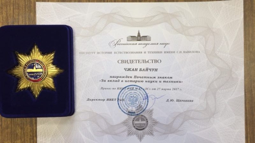 2017年3月27日至31日,在莫斯科举行俄罗斯科学院科技史所第23届国际科技史年会暨85周年所庆会议上,中国科学院自然科学史研究所张柏春研究员被授予“科学技术史贡献”奖章。“科学技术史贡献”奖章制度由俄罗斯英雄、两次升空的宇航员、俄罗斯科学院通讯院士、俄罗斯科学院科技史所原所长巴图林教授为繁荣科技史事业而提议设立。今年是继2012年以来第二次颁奖,共有4名国外学者获得奖章。