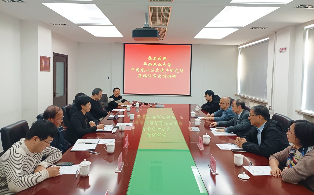 2023年12月25日下午,华南农业大学中国农业历史遗产研究所所长王福昌教授一行来自然科学史所调研,科学史所党委书记、副所长赵力主持调研座谈会,赵力对华南农业大学中国农业历史遗产研究所来访表示热烈欢迎,双方围绕学科建设、科学研究、研究生培养以及图书资源和期刊建设进行深入交流和研讨。