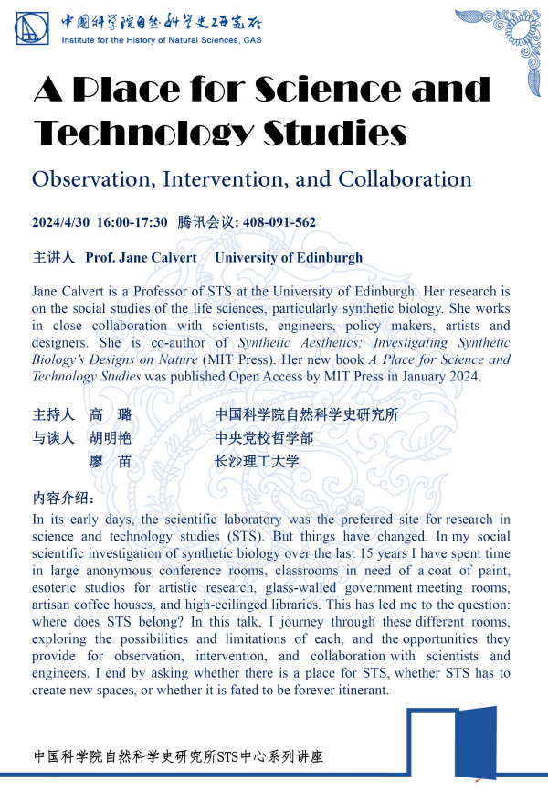 2024年5月9日下午,中国科学院自然科学史研究所科技与社会研究中心邀请了英国爱丁堡大学Jane Calvert教授做了题为‘A place for Science and Technology Studies: Observation,intervention,and collaboration’的报告。报告由中国科学院自然科学史所科技与社会中心主任高璐副研究员主持,中央党校胡明艳副教授,长沙理工大学廖苗副教授评议。下午16:00,报告在线上开始,来自清华大学、爱丁堡大学、国科大、长沙理工大学以及科学史所的近30位老师和同学参加了研讨。