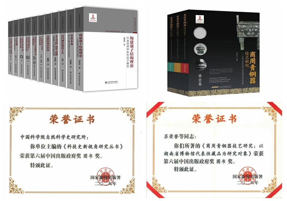 3月27日,第六届中国出版政府奖表彰座谈会在京召开,自然科学史研究所“十三五”重大突破项目“科技知识的创造与传播”二期项目成果《科技史新视角研究丛书》(11卷13册)和“十三五”重点培育方向项目“传统制造技术专题研究”成果《商周青铜器技艺研究——以湖南省博物馆代表性藏品为研究对象》荣获“中国出版政府奖图书奖”。