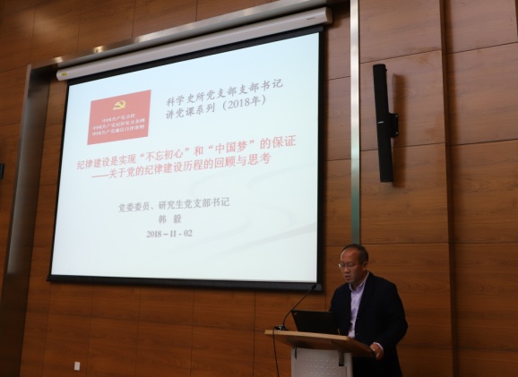 党委委员韩毅作了题为“纪律建设是实现‘不忘初心’和‘中国梦’的保证——关于党的纪律建设历程的回顾与思考”的专题报告。报告从“建党之初中国共产党面临的命运”、“新民主主义革命时期党的纪律建设”、“新中国成立以来党的纪律建设”、“党的纪律建设的经验、教训与启示”和“每一个共产党员应时刻牢记‘初心’与‘使命’”五个方面,以不同时期党中央颁布的法律、法规文献和档案资料为基础,详细地回顾了从1921至2018年间,党的纪律建设如何在历史的长河中一步步不忘初心,继续前进,从建党之初纪律建设的初步创建,到新民主主义革命时期的党的纪律建设日渐成熟,再到社会主义时期党的纪律建设体系臻于完善,以及各个时期党的纪律建设的经验、教训与启示等,为党员深入学习《中国共产党纪律处分条例》上了一堂精彩的党课。
