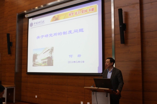 2014年3月4日,院党组成员、副秘书长、北京分院院长、京区党委书记何岩到自然科学史研究所做主题为《关于研究所的制度问题》的专题报告,报告会由所长张柏春主持。研究所党政领导班子、各部门负责人和全体职工参加了此次报告会。