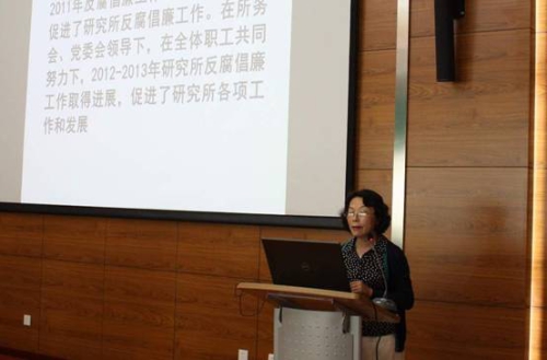 马扬介绍了院监审局、京区党委开展研究所反腐倡廉量化评价工作的意义、要求和具体部署;袁萍代表研究所党政领导班子汇报了研究所2012-2013年反腐倡廉工作情况,总结了两年来廉洁从业风险防控、内部审计监督、作风建设检查监督、惩防体系基础工作等方面的计划、部署、安排、落实情况以及取得的成效,并对全所职工参与、支持反腐倡廉工作表示了感谢。