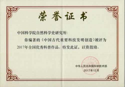由自然科学史研究所策划编著的《中国古代重要科技发明创造》继获得“2016中国好书”后,又传喜讯,被评为2017年全国优秀科普作品。该书于2016年6月正式出版,成为首部完成的“十三五”国家重点出版物出版规划项目,一经发行,在社会上引起了广泛的反响,获得多方好评。