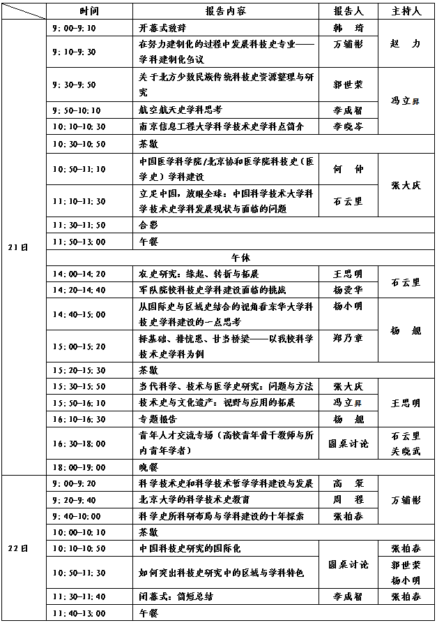 为介绍科技史学科的研究现状,也为了向年轻学者及在读研究生传授科技史研究的方法、经验与体会,共商科技史学科的问题、挑战、未来发展方向,会议上广西民族大学万辅彬教授、内蒙古师范大学郭世荣教授、北京航空航天大学李成智教授、南京信息工程大学李晓岑教授、北京协和医学院何仲教授、中国科学技术大学石云里教授、南京农业大学王思明教授、国防科技大学杨爱华教授、东华大学杨小明教授、景德镇陶瓷大学郑乃章教授、北京大学张大庆教授、清华大学冯立昇教授、清华大学杨舰教授、山西大学高策教授、北京大学周程教授等专家围绕各自的研究领域、所在科研院所教学现状等问题做了专题报告。