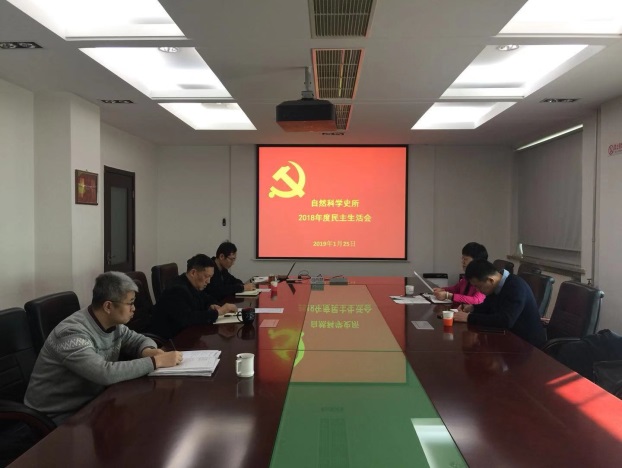 2019年1月25日,自然科学史所召开2018年度民主生活会,所长张柏春、党委书记兼纪委书记赵力参加会议,所长助理关晓武和孙显斌列席会议,北京分院监察审计处副处长冯越代表北京分院到会指导工作。
