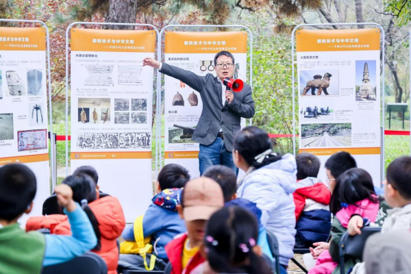 在创工坊栏目,科学史所开展了主题为“钢铁技术与中华文明——中国古代大发明展览与实验”的活动。黄兴老师以其幽默风趣的讲解方式,将中国古代钢铁技术的发展历程和相关科技史知识生动地呈现给观众。他不仅深入讲解了技术细节,还巧妙地结合历史故事,如“越王勾践”的典故,将展区内的氛围推向了高潮,吸引了众多观众的参与。观众们近距离观察了铁矿石、炉渣、汉代环首铁刀等文物,动手操作金相显微镜,并参与铁丝在氧气中燃烧的实验。