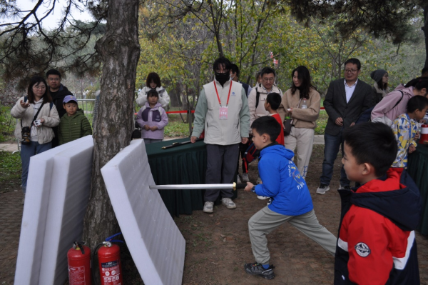 让孩子们拿起仿制的宝剑,刺向泡沫板,通过这种互动方式,孩子们在玩乐中理解了钢铁在古代武器中的应用,以及它与现代武器的联系。