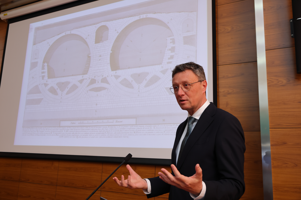 在主旨报告中,Patrick Cramer系统阐述了他对未来科学走向、学科交叉逻辑和国际合作模式的思考。他回顾了走访马普学会全部84个研究所并与约1,000名研究人员交流的经历,通过射电望远镜中德合作、太空视角追踪动物迁徙、亚马逊雨林气候监测、核聚变能源探索、人工智能伦理挑战等跨学科案例,展示了当代科学在拓展认知边界的同时,也正以前所未有的深度介入人类社会的现实问题。他强调,自然科学的进步离不开人文社会科学的涵养与支撑,并以伽利略亲手绘制月球观测图为例指出,科学与艺术始终相互滋养。谈及国际合作,他提出欧洲理应在全球科学格局中发挥桥梁作用,推动构建更具韧性的多边合作网络。