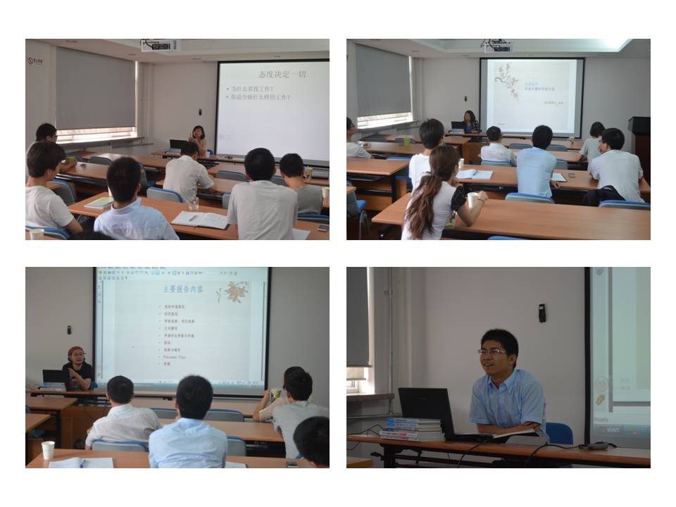 五位毕业生代表分别就如何就科研、考博、留学、找工作等大家关注的方面做了耐心细致的经验介绍。刘浩同学介绍了考博流程、注意事项以及校内外考博的异同,并解答了同学们关于考博的疑问;余佳同学准备了专业、详细的ppt,将如何申请美国留学介绍的非常透彻;陈丹阳同学从个人经历谈起,讲述自己如何选题、做科研,并分享了自己三年的学习生活;冯博同学和韩天琪同学分别从找工作的“硬件”和“软件”准备开始,谈及就业环境、技巧、资源,个人体会等内容。