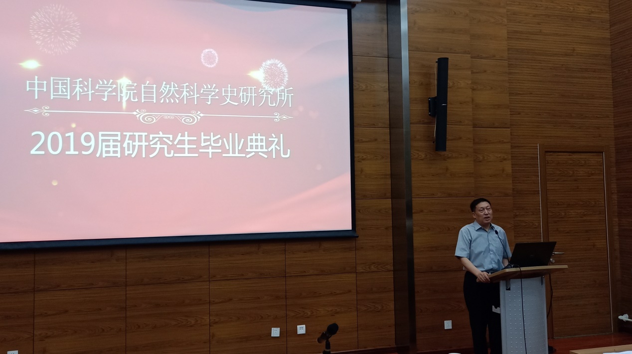 自然科学史研究所2019届毕业典礼暨学位授予仪式于7月5日上午在学术报告厅举行,所长张柏春研究员、所学位评定委员会主任张九辰研究员、副主任邹大海研究员、导师代表、研究生部主任张宗鹤、研究生教育主管付韵蕾、2019届毕业生以及在读研究生一起参加了典礼。会议由党委副书记、纪委书记赵力主持。
