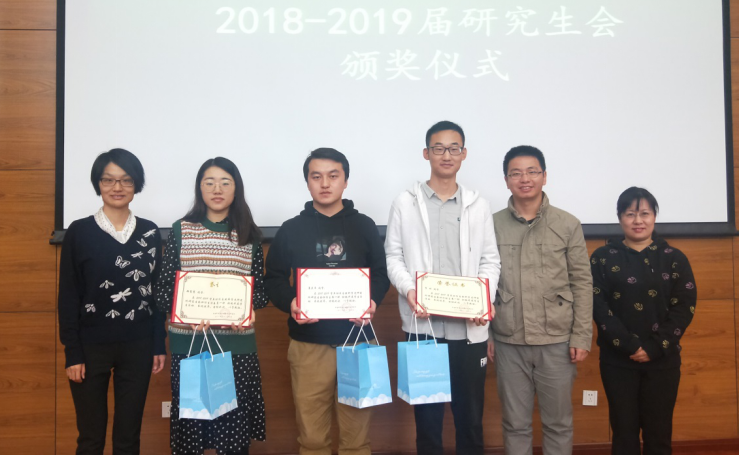 大会第三项由纪巧、王莹、李亮为2018-2019学年研究生会成员颁发荣誉证书,他们分别是研究生会主席夏庆卓,副主席李昕,宣传委员褚英杰,学习委员郑鸳鸳,组织委员吕清琦。