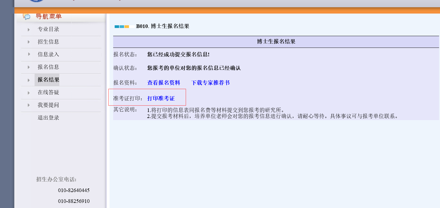 即日起,获得准考资格的考生可在报名系统中打印准考证,获得准考资格名单请见附件1。考生可登录博士网报系统,在“报名结果—准考证打印”页面中,在线打印准考证。