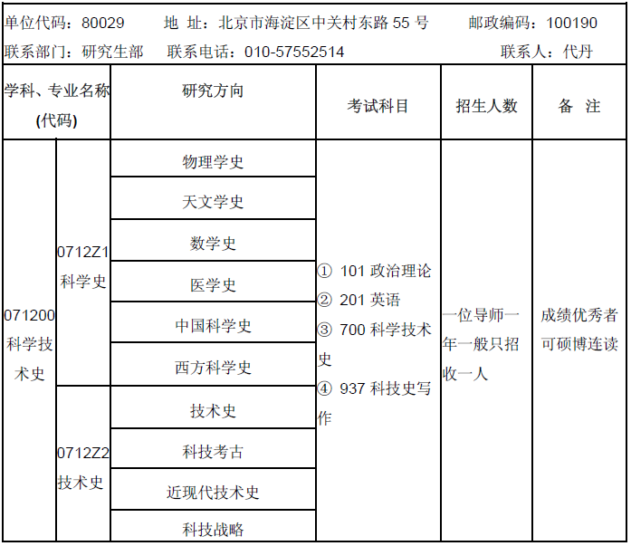 自然科学史研究所2016年招收攻读硕士学位研究生专业目录