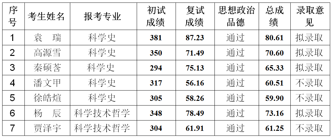 根据初试成绩、复试成绩(低于60分,不予录取)、思想政治品德考核成绩(不通过的,不予录取)和总成绩(百分制,初试成绩占60%,复试成绩占40%),按公布的复试办法、招生指标(科学技术史专业5名,科学技术哲学专业1名)及总成绩由高到低择优选拔的原则,决定拟录取4名考生。现将复试结果通告如下: