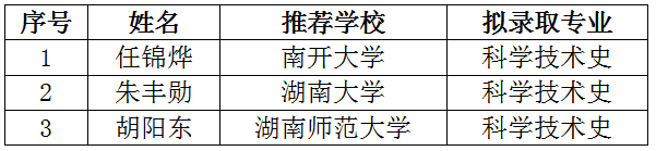 自然科学史研究所2021年推荐免试硕士研究生接收工作已经结束,经所招生领导小组讨论通过,现将拟接收名单公示如下: